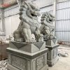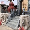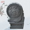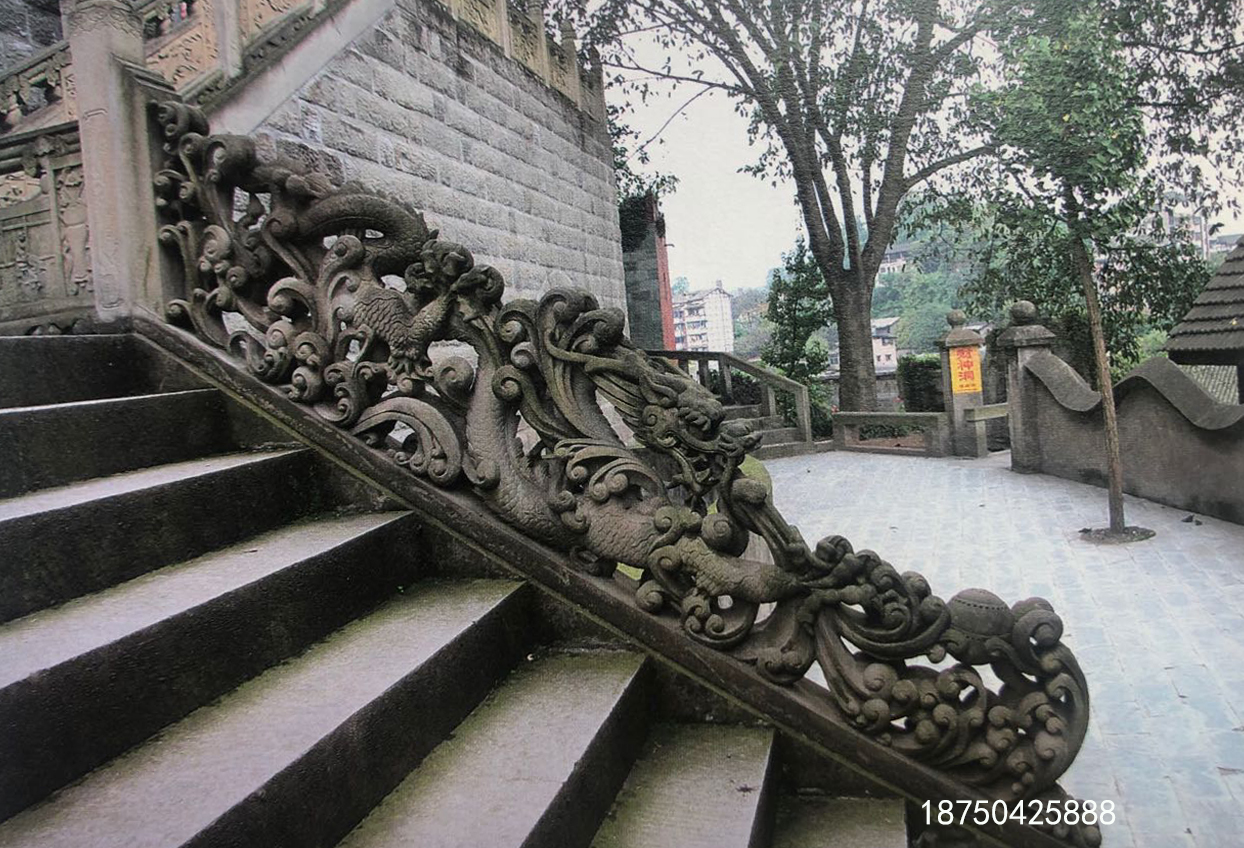 台阶两侧如设防护栏杆,它们的形式则和台基上栏杆相同,只是栏板随台阶的斜度而成为斜边形。但在花饰内容上小有变化,在总体上保持栏杆的协调一致。这里的栏杆随台阶而斜至地面,处于最下端的望柱因为受到上面栏杆的推力而需要有一种构件加以固定。这种构件最常见的形式就是圆鼓形的抱鼓石。一只或大或小的圆鼓,上下用卷草、回纹组成一个三角形的构件支撑住台阶最下端的望柱。在抱鼓石的双面都可以做雕刻裝饰。在各地的石台阶上也见到用狮子代替抱鼓石的,一头石狮子或蹲坐或倒立在地,狮面朝外,背顶着望柱,同时还有护卫上下台阶行人的意义。